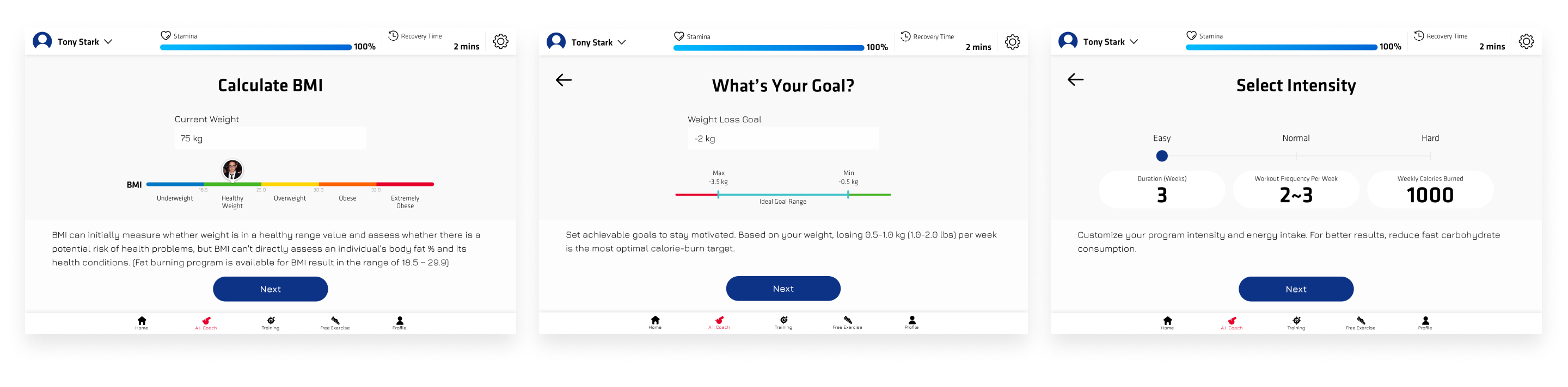 使用者輸入完基本資料,測得 BMI 後,使用者可以設定自己的目標體重,以及訓練計畫的挑戰難度。這些課程紀錄都會上傳至雲端。使用者只要登入或是使用自己的手機 App 連接設備,就可以同步並繼續下一次的訓練。