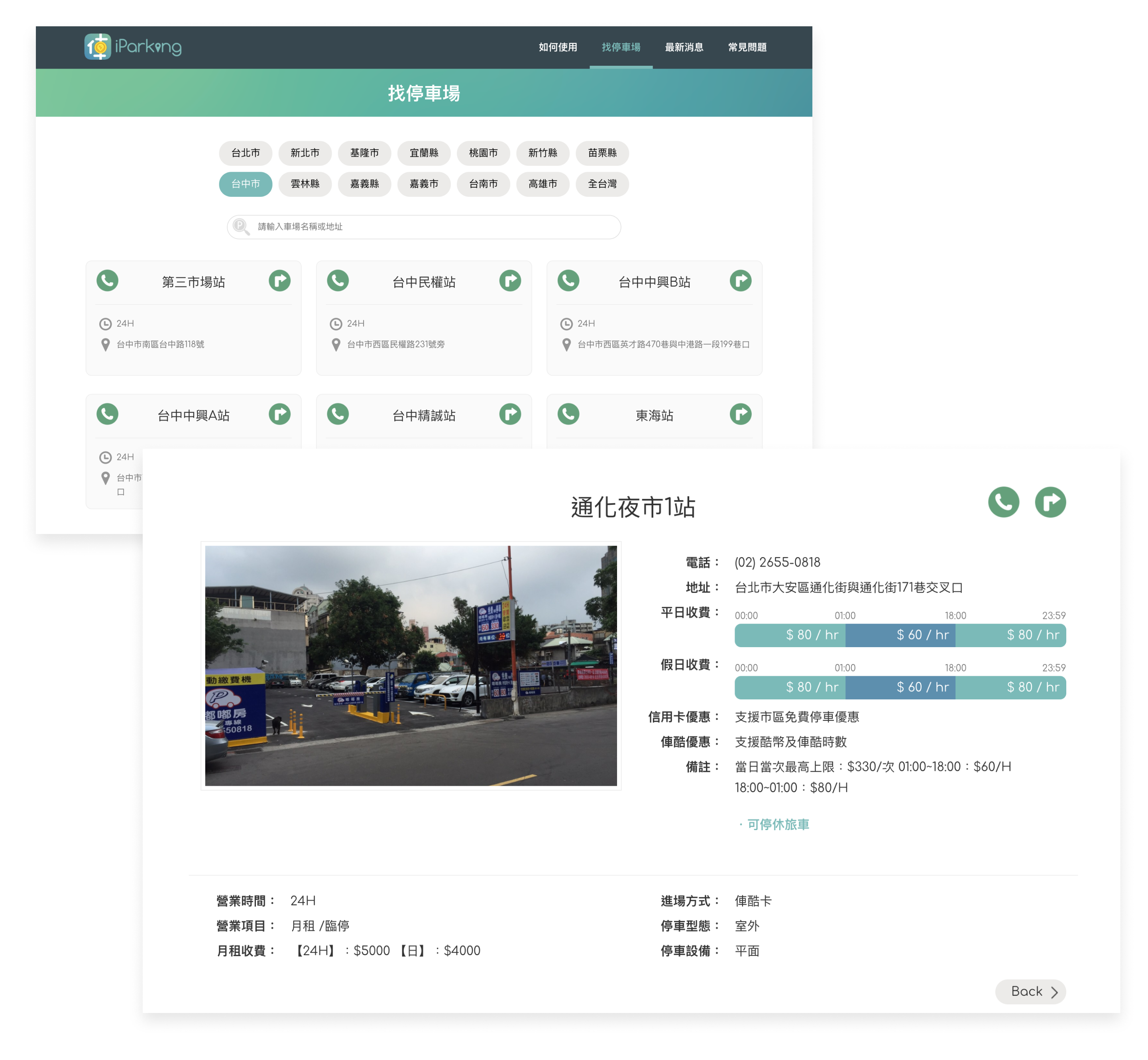 由於停車場的費率會因場地性質、時段而浮動,以往較為複雜的費率都是以純文字顯示,常出現大段文字不易閱讀,我們利用圖示化的長條色塊,將各時段的價格清楚標出,方便開車族一目瞭然。此外,App 內的車場資訊頁面也是以 Webview 直接嵌入官網頁面的方式製作,能讓車場資訊更新更即時。