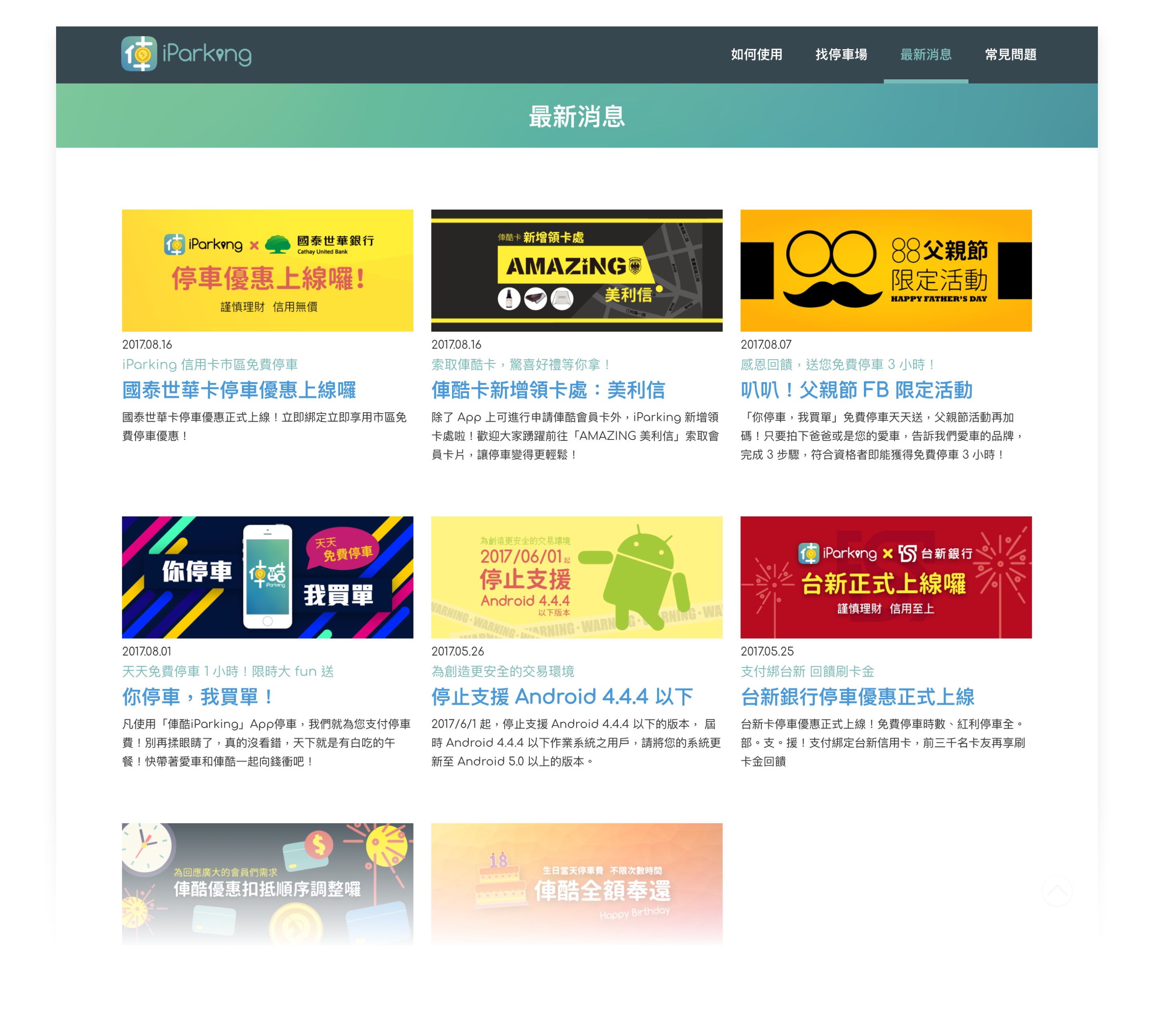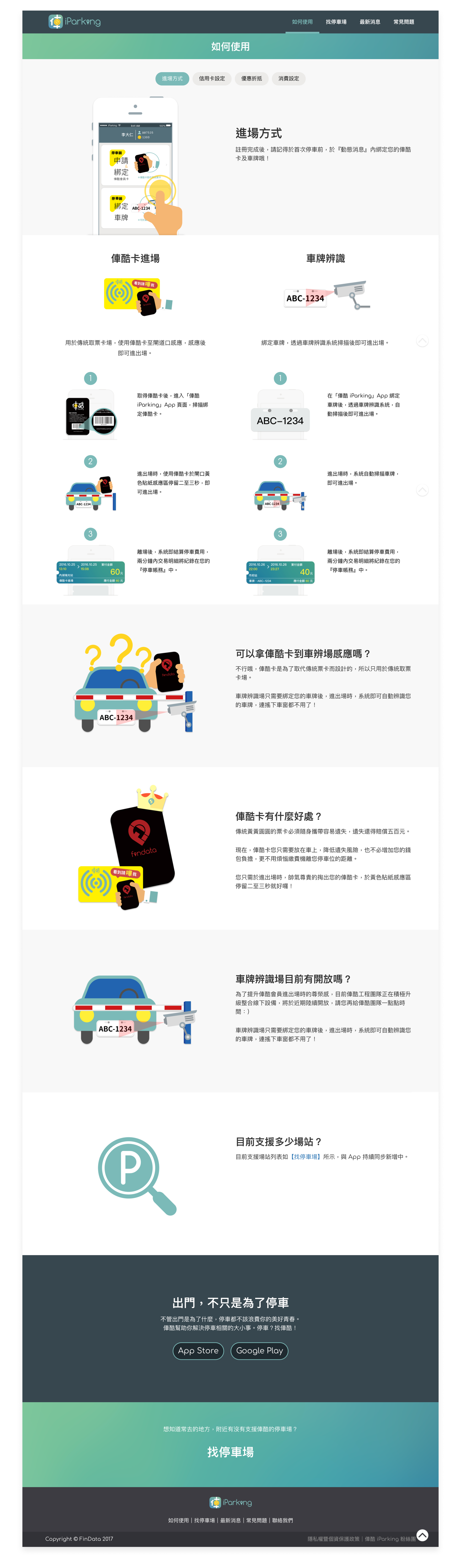 iParking 在 2017 年初正式上線後,透過官網及臉書的搭配宣傳,能讓我們的產品欲解決的痛點更容易被市場理解。而官網的整體敘事架構,則是希望能夠帶領一個完全不懂『行動支付』(What)的使用者,一步一步了解『如何使用』(How),以及『找停車場』(Where)能在哪使用,闡述一個完整的產品故事。